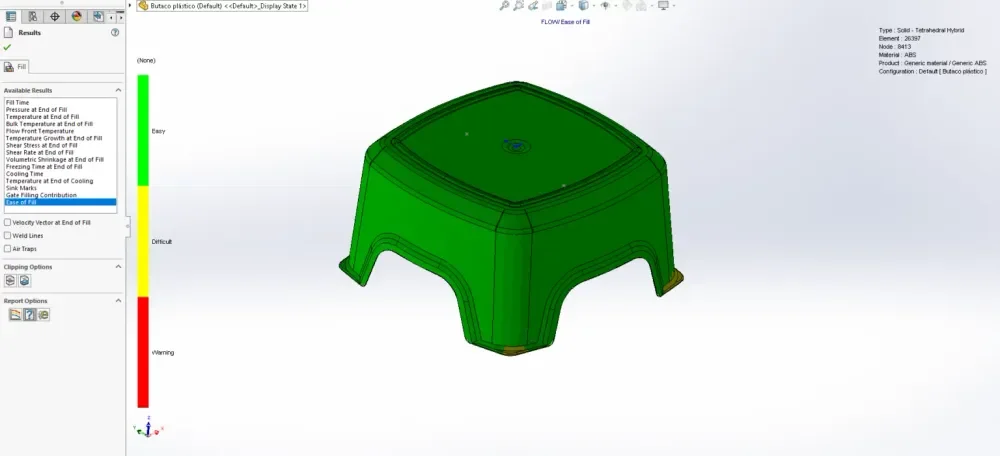 If the ease of fill plot shows yellow or red areas when simulating a part cavity (without runners), you may need to adjust certain factors to decrease the pressure required for filling. Try increasing the wall thickness, changing the injection location, adding more injection locations, modifying the material, or adjusting processing parameters. It is important to do this to ensure successful cavity filling.