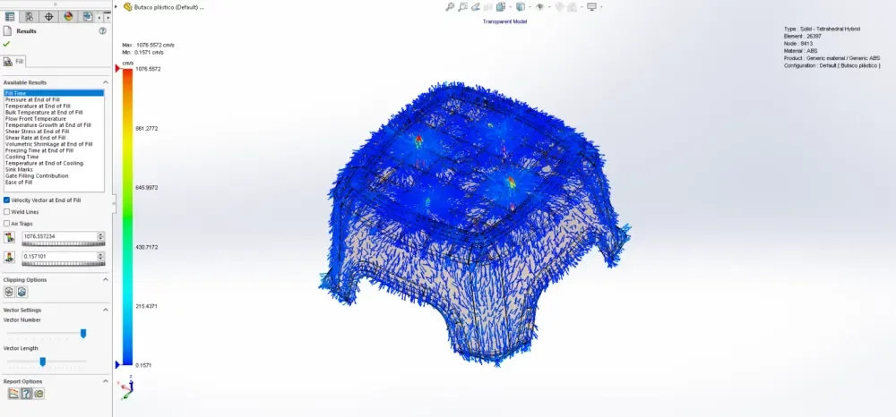 The fill plot's velocity vector shows the molecular orientation of melted plastic as it flows through the mold part cavity. Spherical fillers create a more consistent distribution of mechanical properties in both the flow direction and perpendicular to it. When using fillers with high aspect ratios, the mechanical properties differ in the flow direction compared to the perpendicular direction. Materials with high aspect ratio fillers typically have better properties in the flow direction and lower mechanical properties perpendicular to it.